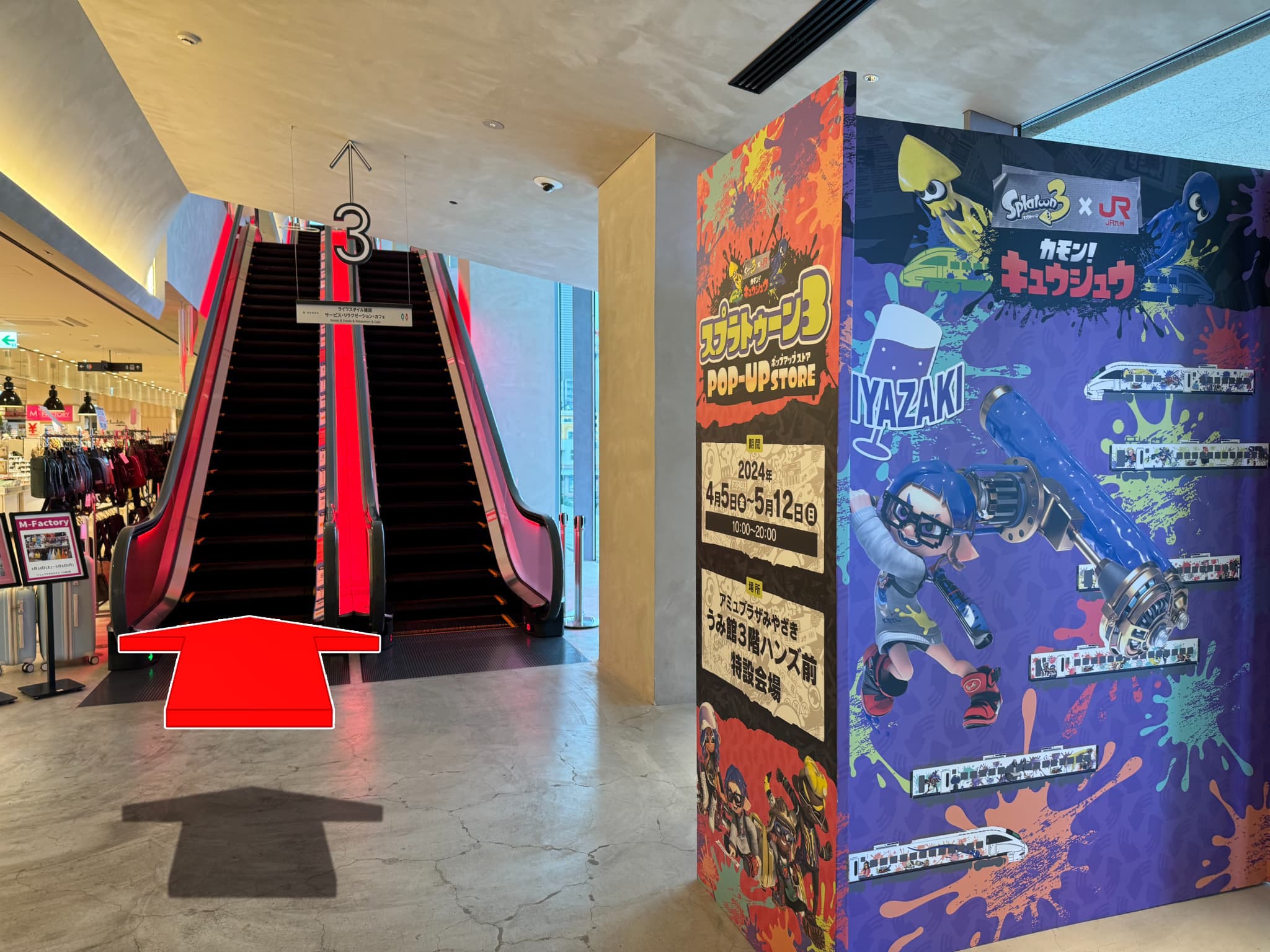 3階に行くエスカレーターに進みます。。2024年1月9日(火)から開催している「Splatoon3×JR九州 カモン!キュウシュウ」の一環として、「カモン!キュウシュウ スプラトゥーン3 POP UP STORE」が期間限定でオープンします! 「カモン!キュウシュウ」オリジナルグッズのほか、Nintendo TOKYO公式グッズなどが販売されます 期間限定ショップ「スプラトゥーン3POP-UP STORE」OPEN! [期間] 2024/4/5(金)~ 2024/5/12(日) [時間] 10:00~20:00 [場所] うみ館3階 ハンズ前 特設会場 【販売商品のご紹介】一部 今回のPOP UP STOREでは、Nintendo TOKYO/OSAKA/KYOTOでの取扱商品を販売。「キュ ウシュウラン」のイベントでも大人気だった「サーモンラン」グッズや、2月22日に配信開始と なった『スプラトゥーン3 エキスパンション・パス』 第2弾「サイド・オーダー」に登場する キャラクターのぬいぐるみも登場します! 【購入特典】 1回のお買い物で、4,000円以上お買い上げのお客さまに、『オリジナル缶バッジ』または、『カモン!キュウシュウオリジナルステッカー』がプレゼント! ※プレゼントは先着順です。なくなり次第終了となります。 ※プレゼントはどちらか1つをランダムでお渡しします。 まとめ スプラトゥーンファンは必見です! ※その他、アミュプラザみやざき館内にフォトスポットも登場します 目玉は「カモン!キュウシュウ」オリジナルグッズですね!