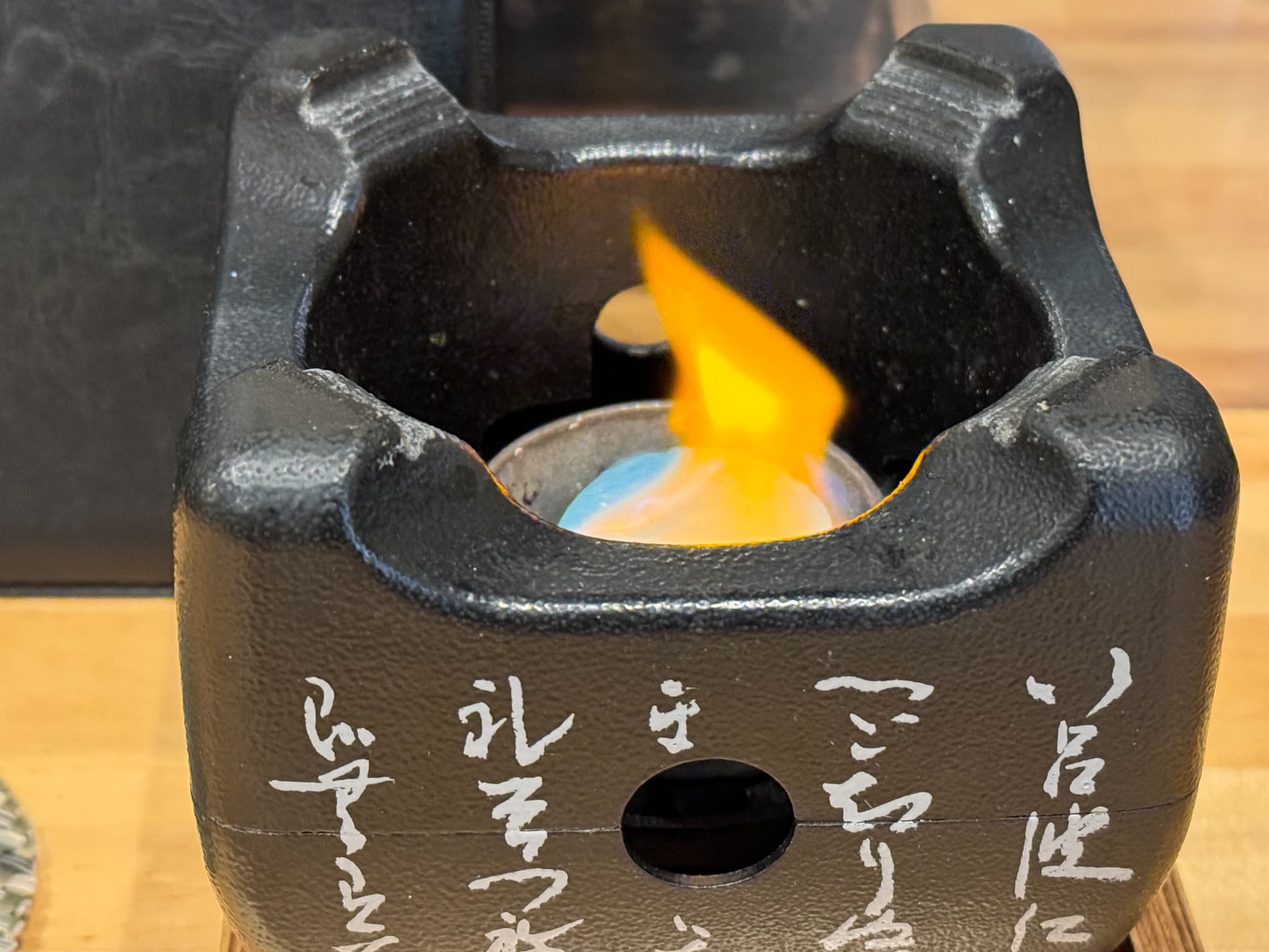 注文すると、1人用の石焼きコンロが用意され、固形燃料に火をつけてもらい、料理が出てくるまで、石板を熱して待ちます。