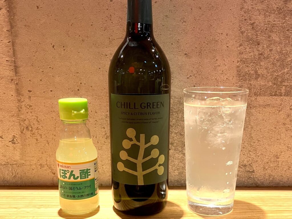ベースとなる焼酎は、濵田酒造が手がけるボタニカル系麦焼酎 CHILL GREEN (spicy & citrus)。そこに、柑橘果汁と酢で作られた“ぽん酢”を、自分の好みの量で追加できる点が特徴です。