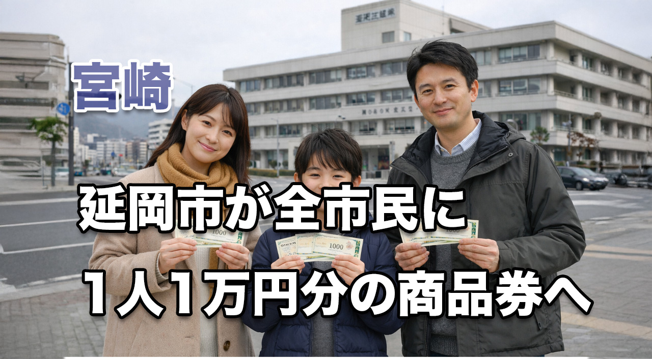 延岡市は、物価高騰が続く中で市民生活の負担を軽減し、市内消費の下支えにつなげるため、全世帯の世帯主に対して世帯人数に応じて1人あたり1万円分の「のべおか生活応援商品券」を配布する方針を示しました。配布は電子版または紙版で行う予定で、電子版には地域ポイント付与などの仕組みも示されています。ここでは、延岡市が公表している資料と報道で確認できる範囲に限定し、間違いのない形で内容を整理します。